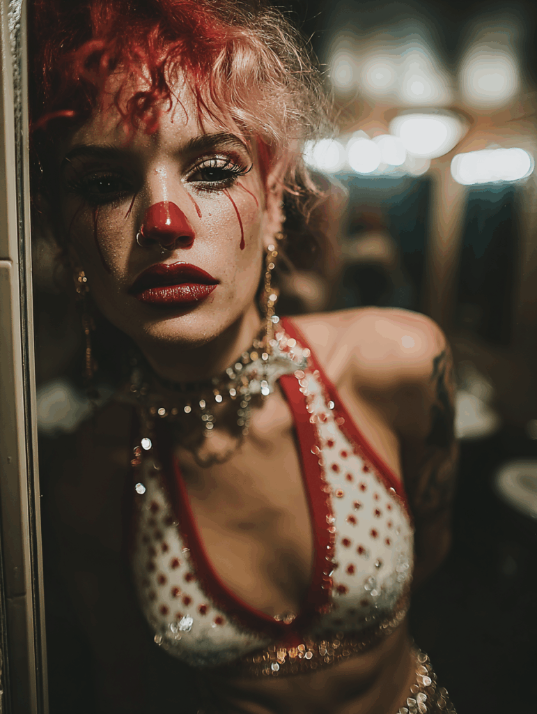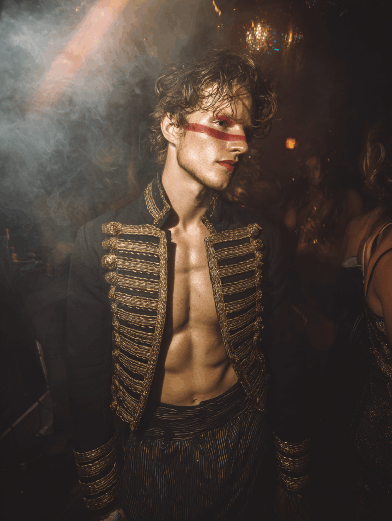 Think dirty glam. Think excessive fashion. Think circus-inspired silhouettes, theatrical layers, bold materials, masks, makeup, textures, harnesses, shine, darkness, exaggeration.